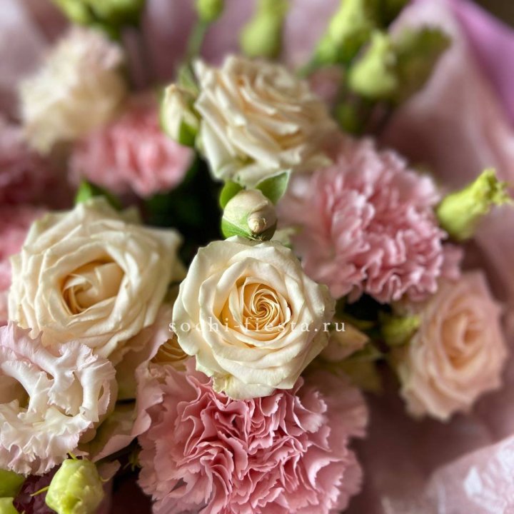Состав сборных букетов в Краснодаре: розы (Freedom, Mondial), хризантема кустовая, альстромерия, эустома, фрезия. Дополнительно в сезон — тюльпаны, нарциссы, ранункулюсы, ирис. Поставки в Краснодаре раз в 3-5 дней из ближайшего регионального центра. Флорист планирует ассортимент под дату поставки и знает, что будет в наличии к нужному дню.
