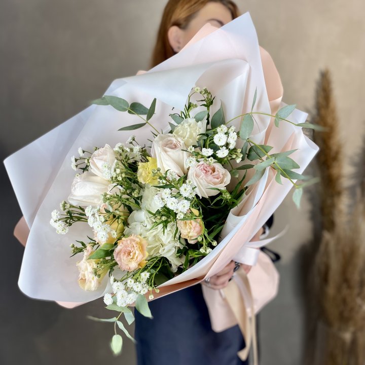 Состав сборных букетов в Краснодаре: розы (Freedom, Mondial), хризантема кустовая, альстромерия, эустома, фрезия. Дополнительно в сезон — тюльпаны, нарциссы, ранункулюсы, ирис. Поставки в Краснодаре раз в 3-5 дней из ближайшего регионального центра. Флорист планирует ассортимент под дату поставки и знает, что будет в наличии к нужному дню.