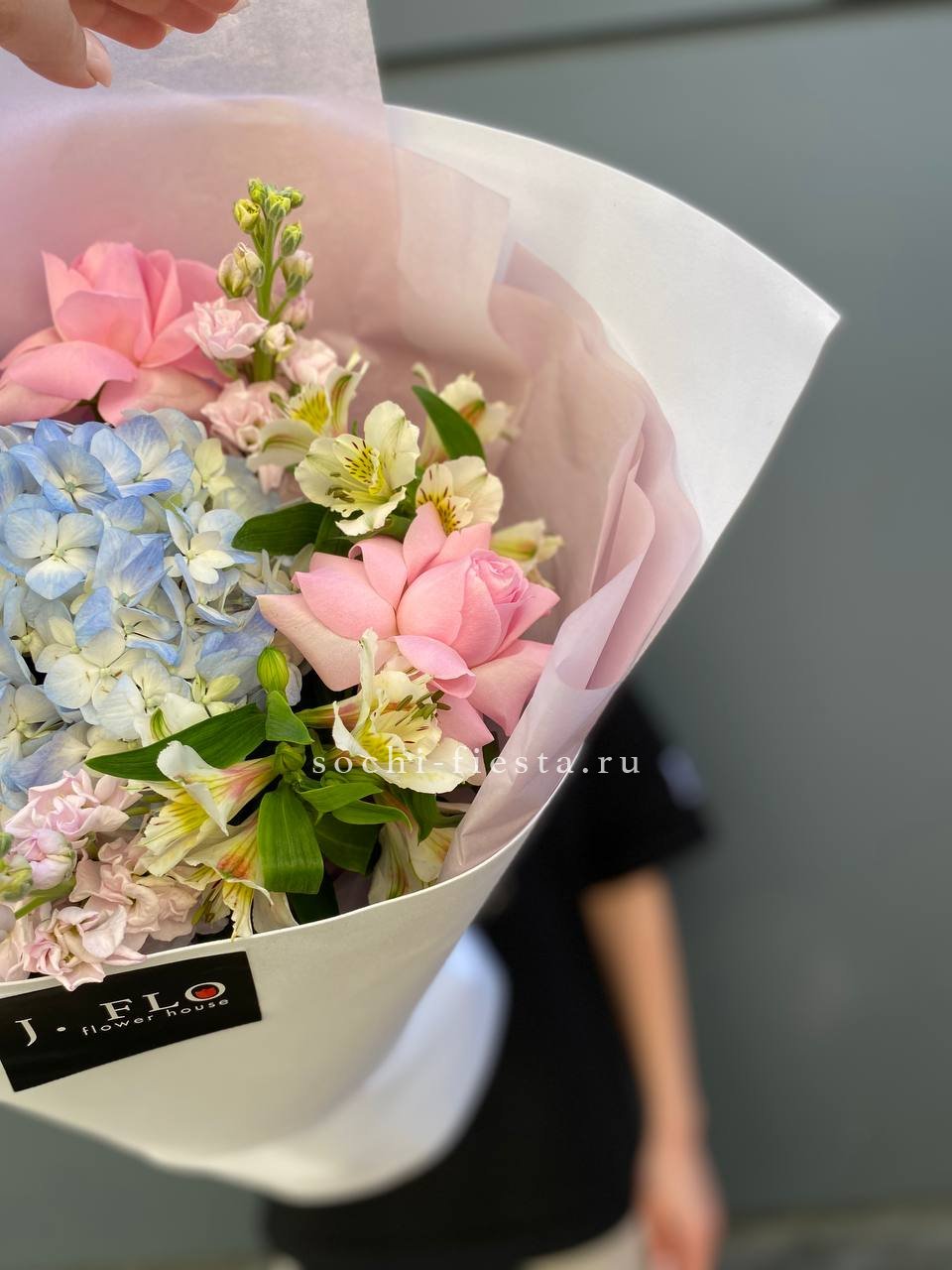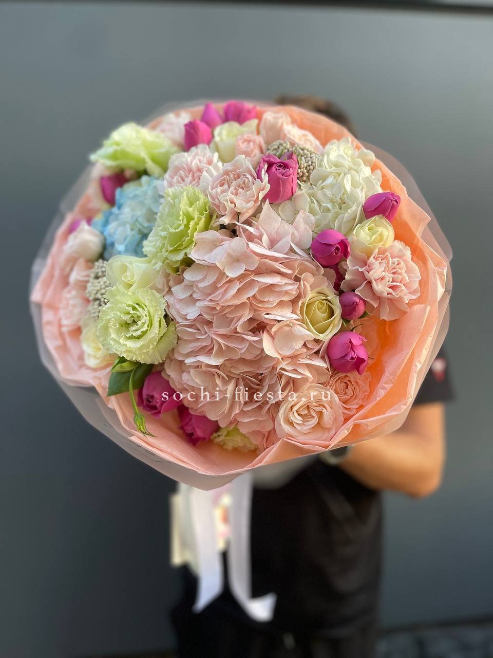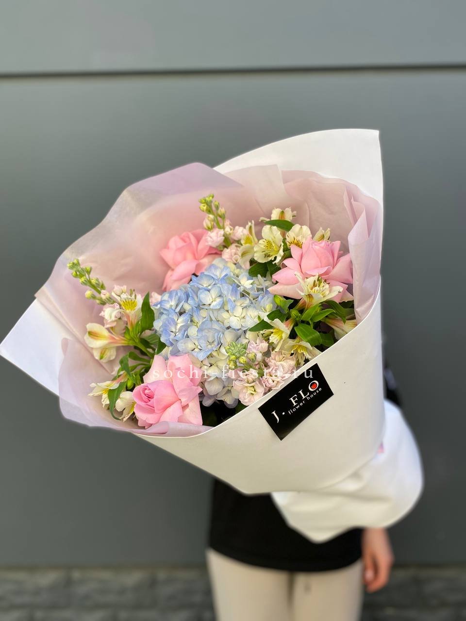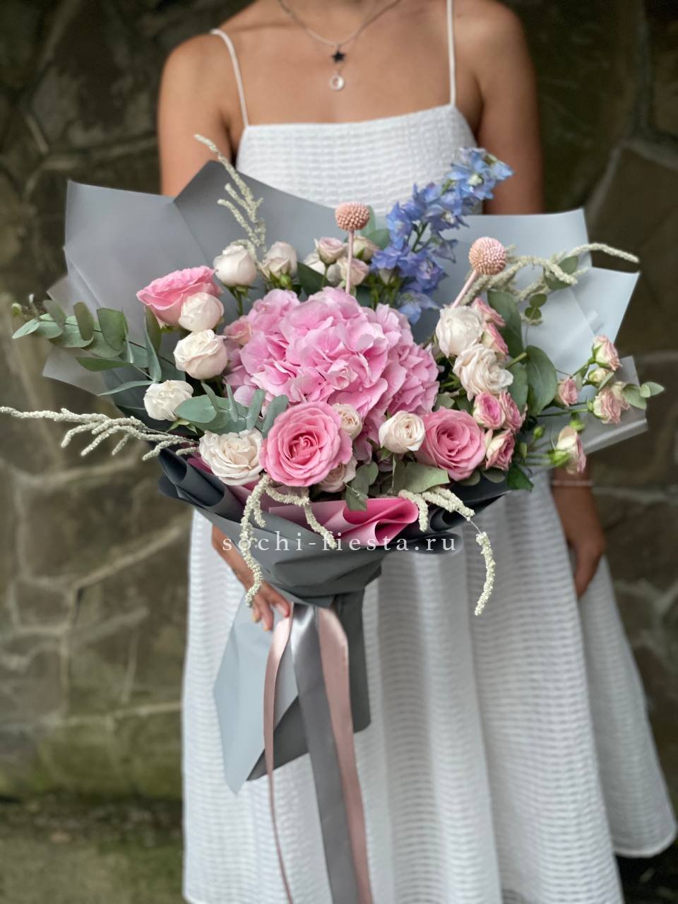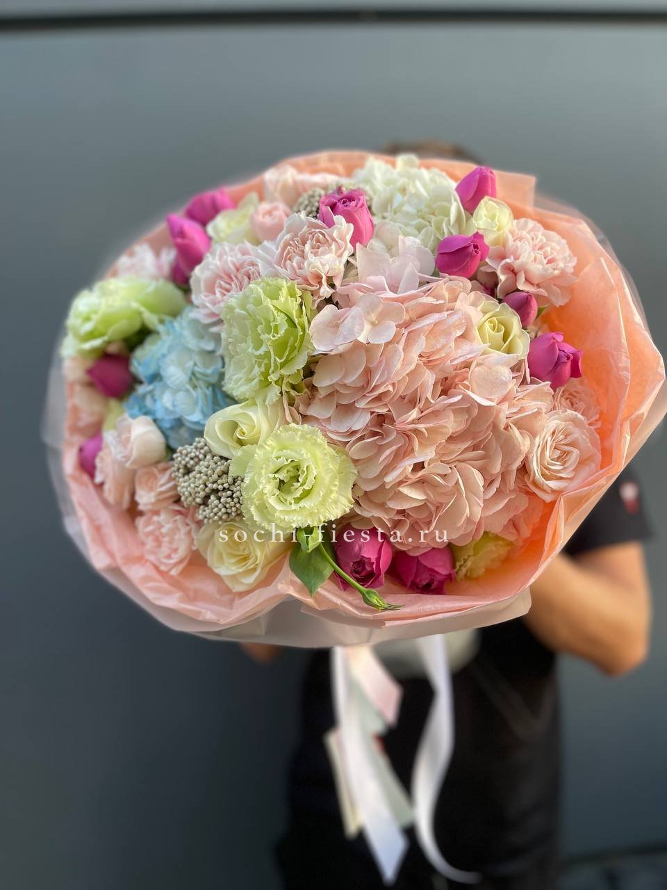 Плотная сборка с пышными соцветиями гортензии и яркими герберами создает объемный силуэт. Маттиола и лимониум добавляют воздушности по краям, а диантусы заполняют центр мягкими переходами.