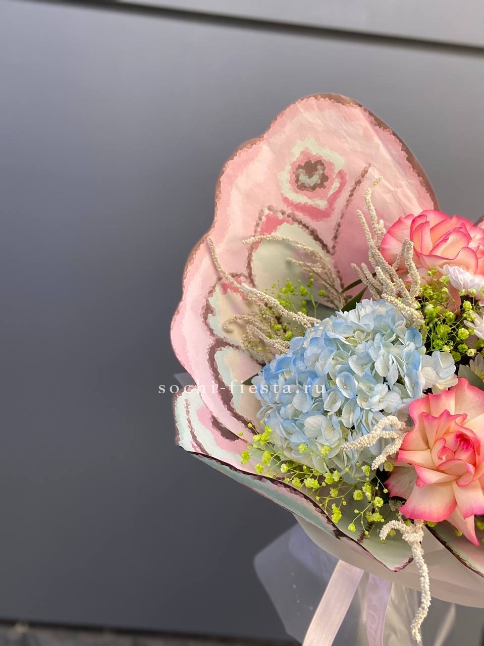 Розовые розы, пионовидная кустовая роза, эвкалипт,  лента, авторская упаковка.