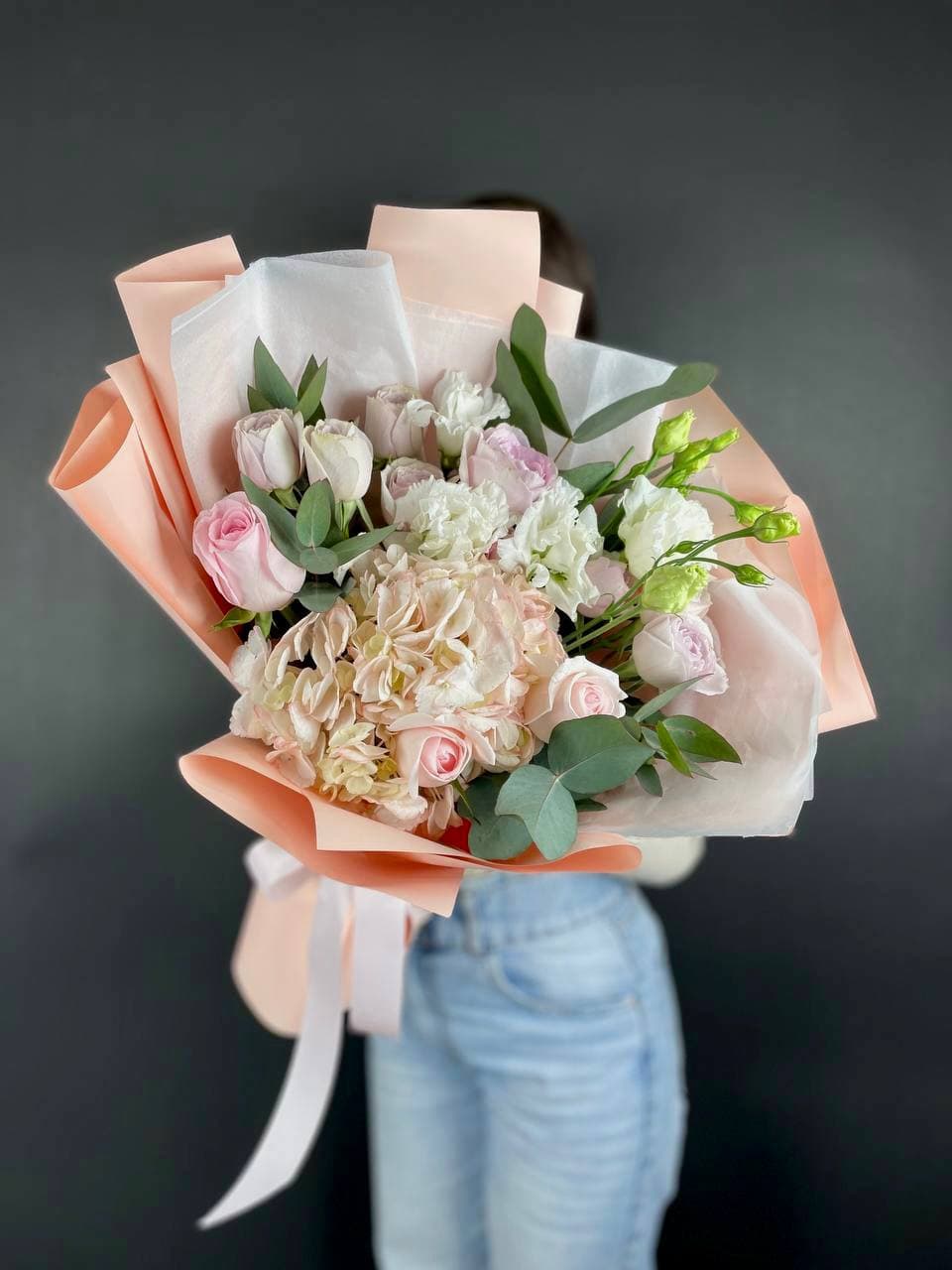 Пионы раскрываются пышными шапками, розы добавляют структуру, а маттиола наполняет букет вертикальными линиями. Тишью и пленка создают лаконичную обёртку, не перебивая природную красоту. Композиция выглядит свежо и объёмно.
