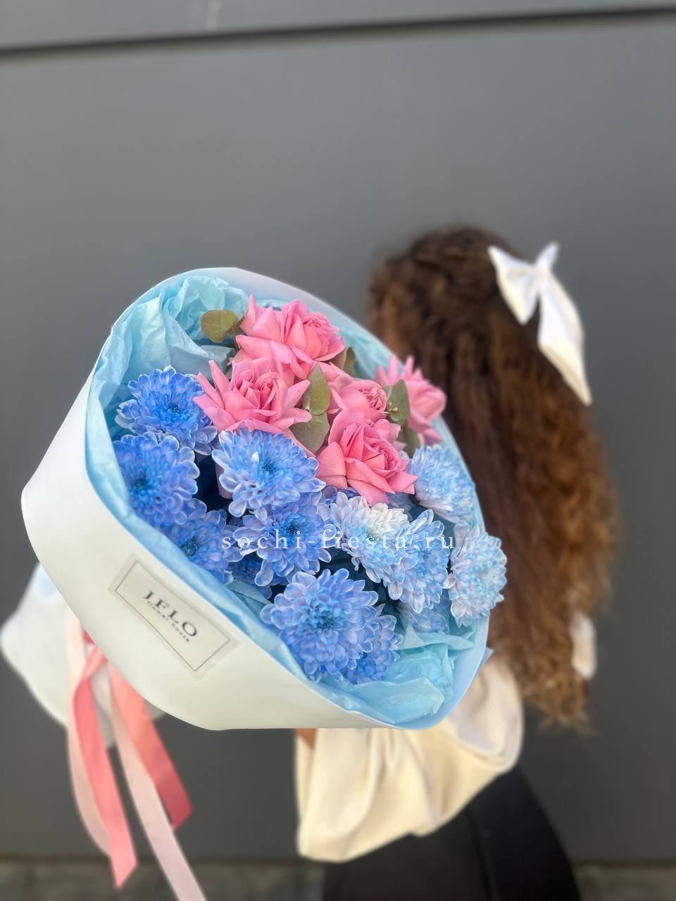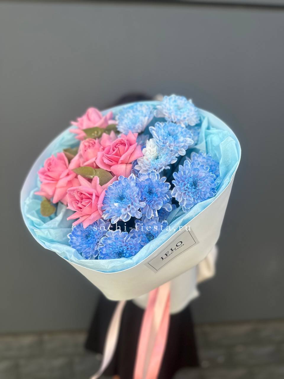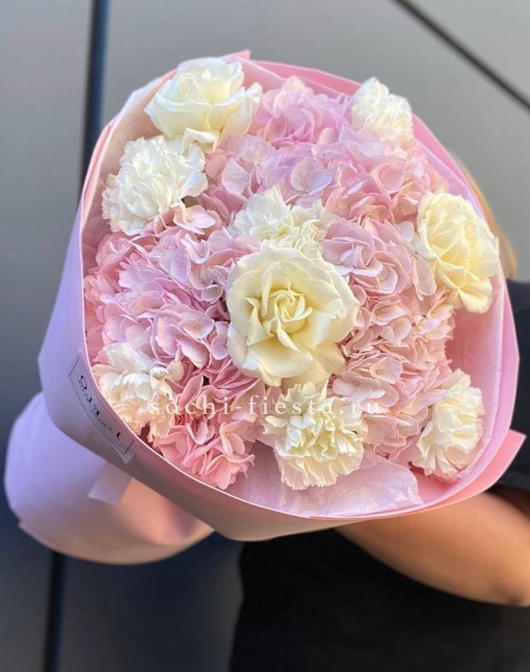гортензия, хризантема, хамелациум, гербера, мисти баблс, диантус, пленка.