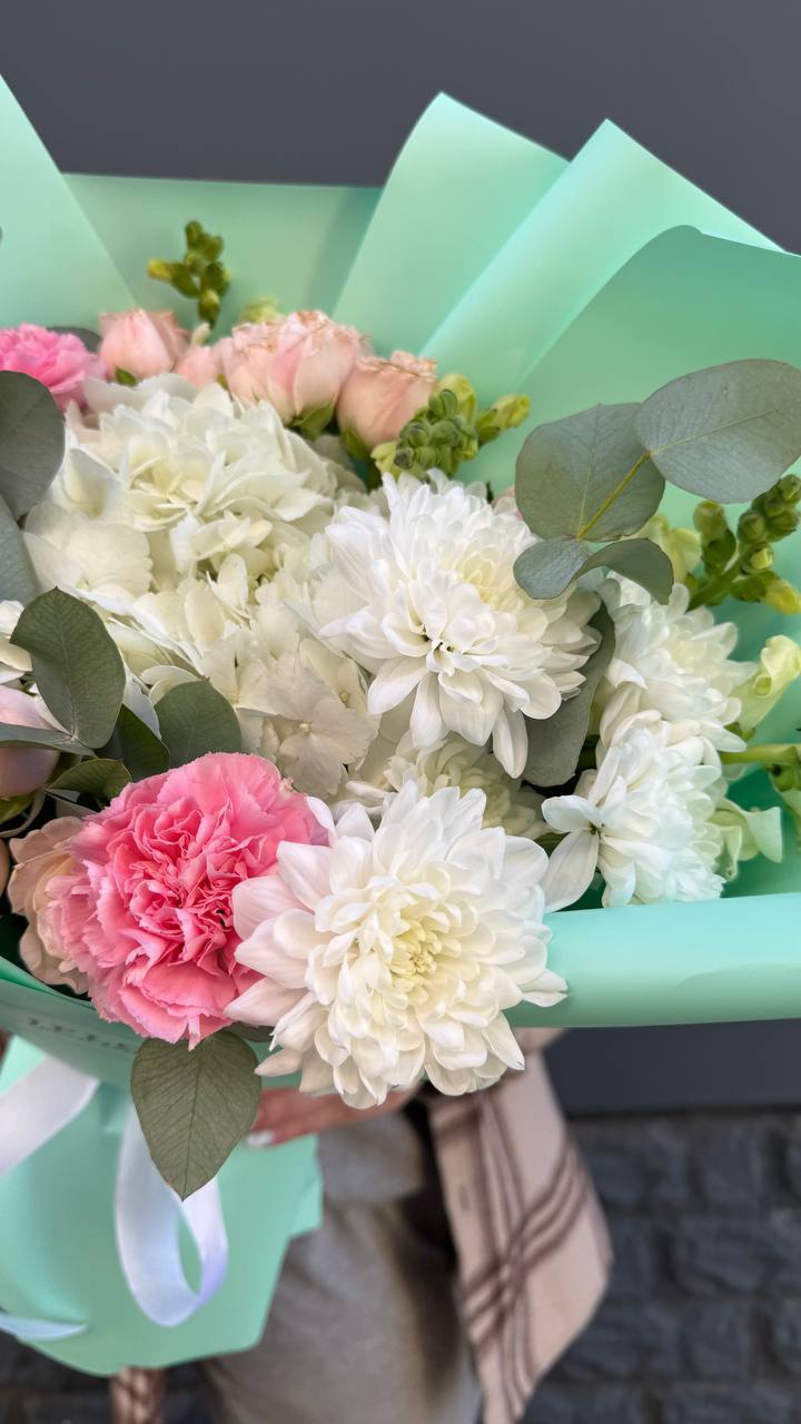Этот пышный авторский букет в мятно-пастельных тонах — само воплощение весенней свежести и легкости.