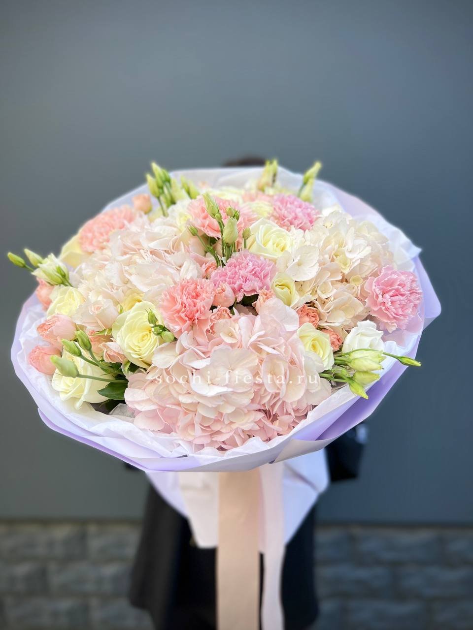 Розовые розы и диантусы окружены пышными соцветиями маттиолы и бомбастика. Композиция собрана плотно, каждый цветок поддерживает соседний, создавая объемную округлую форму. Букет держит силуэт и выглядит цельно с любого ракурса.