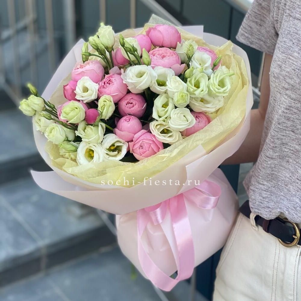 Кустовые розы и эустомы собраны в компактную форму с мягкими линиями. Сочетание нескольких оттенков создаёт живописный эффект без лишней пышности.