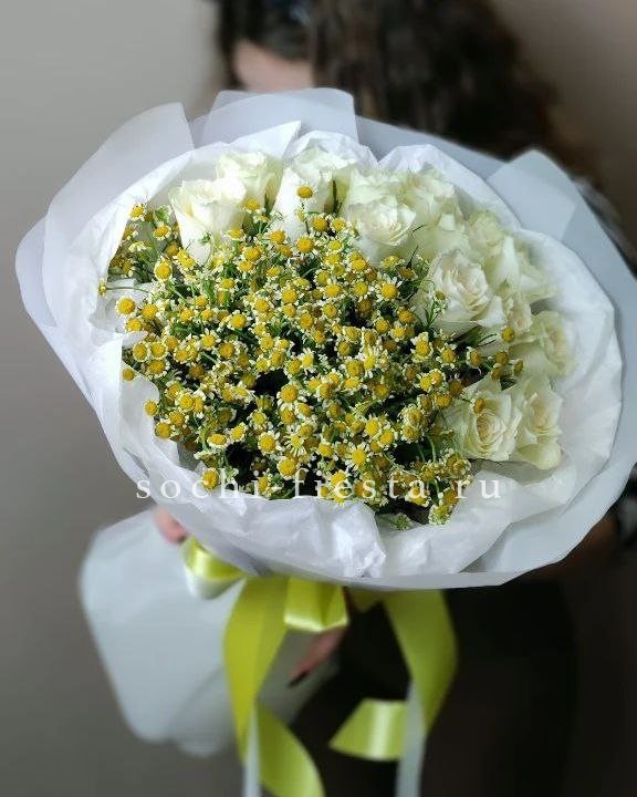 Белоснежные ромашки танацетум камилла образуют воздушное облако вокруг бутонов роз. Свежая композиция с летним характером и легким настроением.