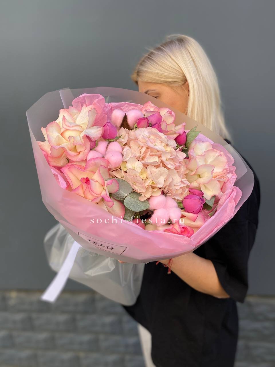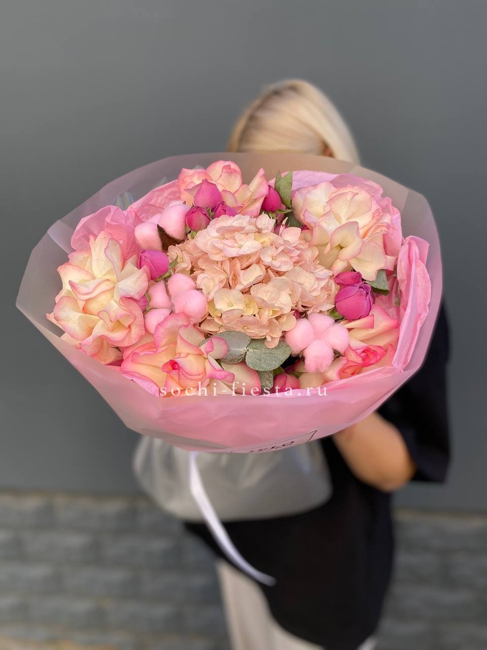 гортензия, гербера, роза, эвкалипт, оформление, лента.