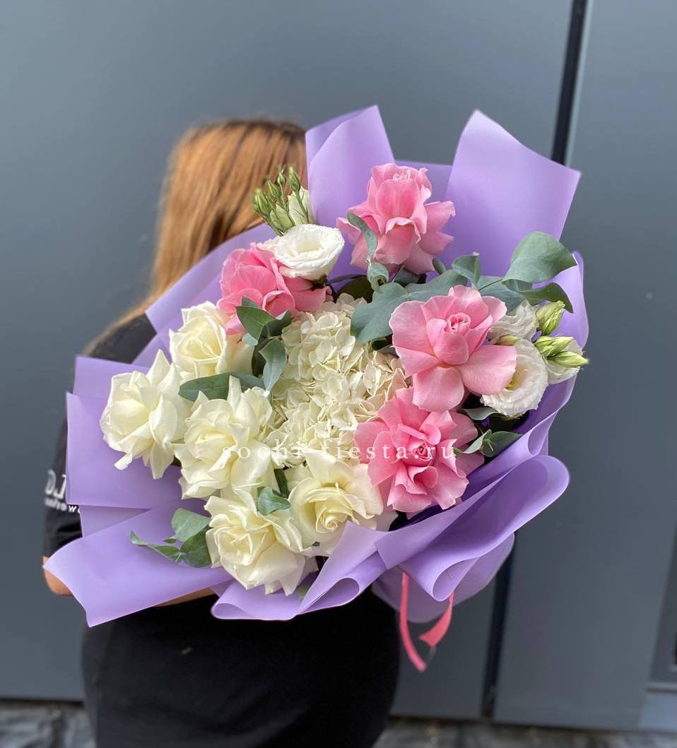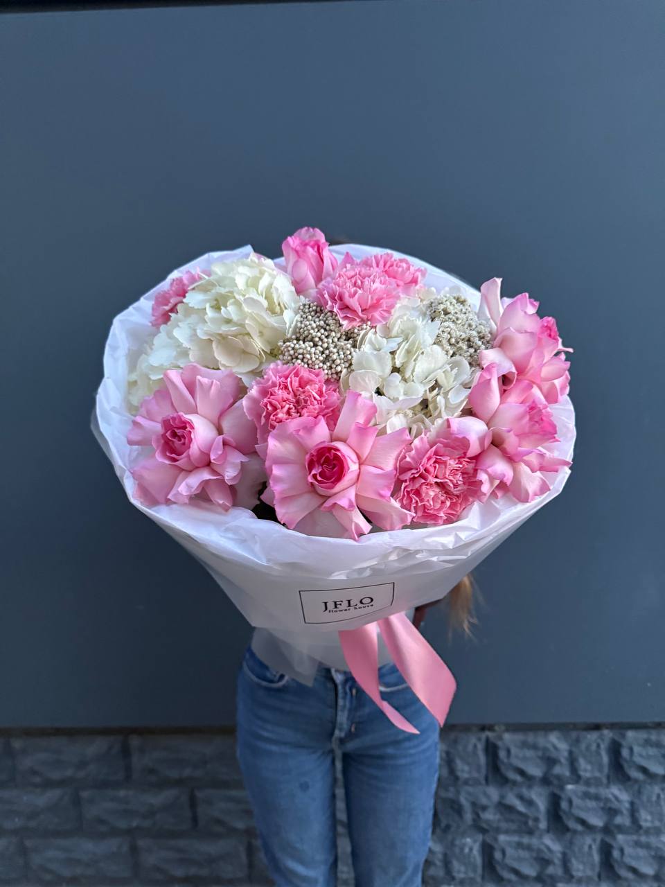 гортензия, пионовидная роза, озотамус, белая роза в нежном оформлении.