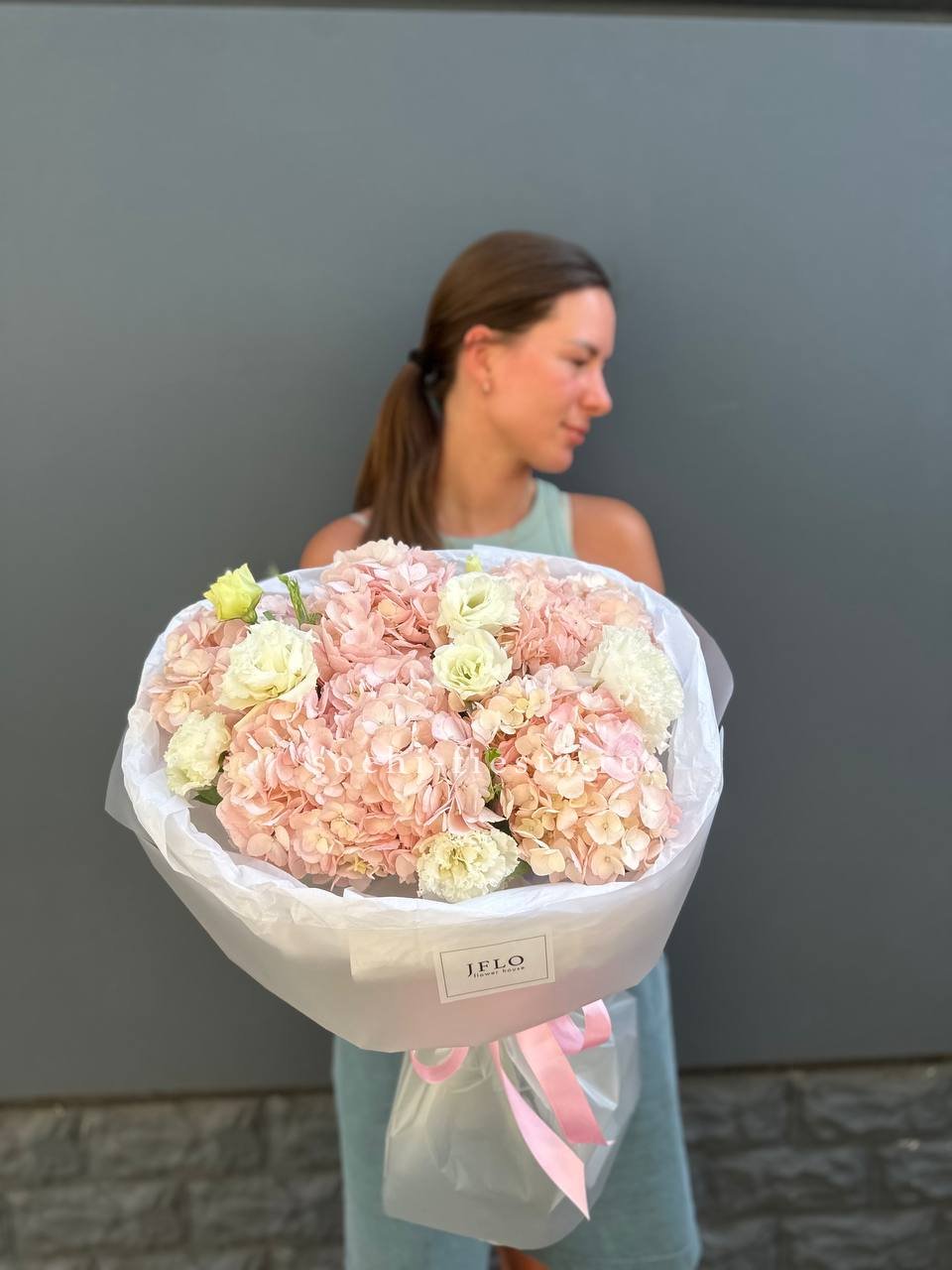 гортензия, розовые розы, кустовые розы, маттиолы,, лимониум лента и дизайнерская пленка.