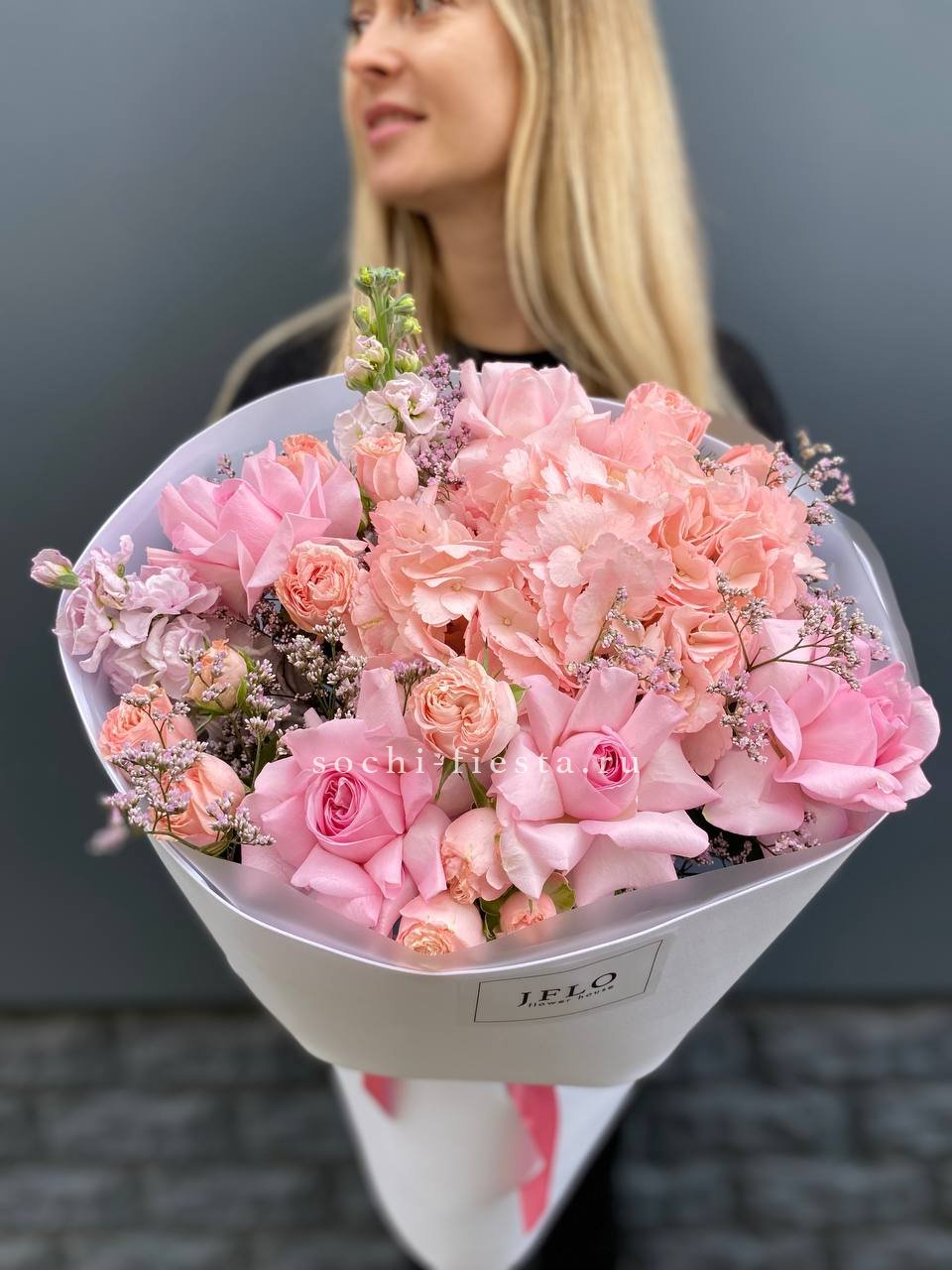 Воздушная гортензия окружена розовыми бутонами и душистой маттиолой. Лимониум добавляет букету лёгкую дымку, а общий силуэт остаётся мягким и собранным.