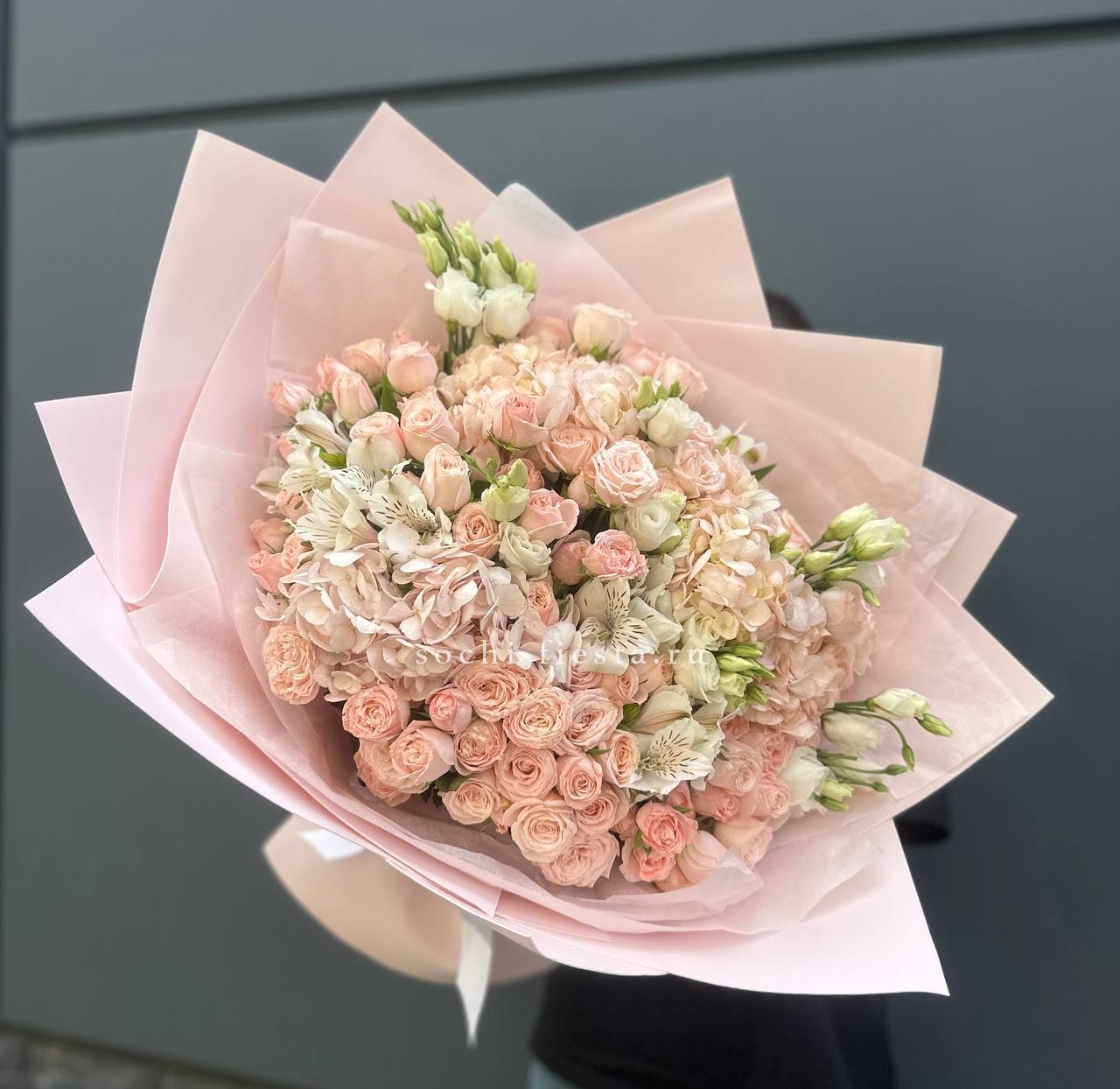 кустовые розы, эустомы, гортензии, альстромерии, лента и дизайнерская пленка.