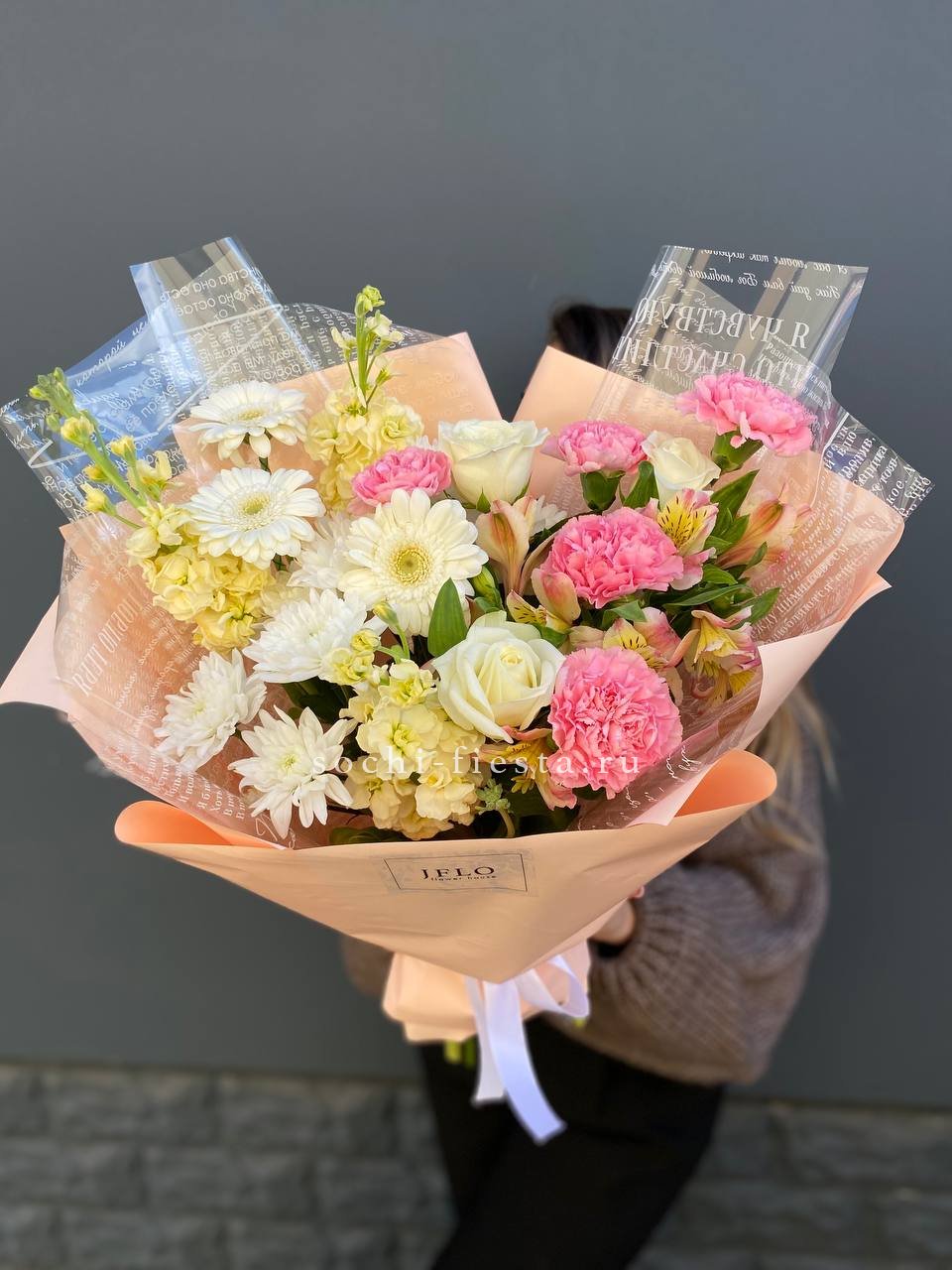 маттиола ,белые розы, хризантемы герберы, альстромерии, диантусы, лента и дизайнерская пленка.