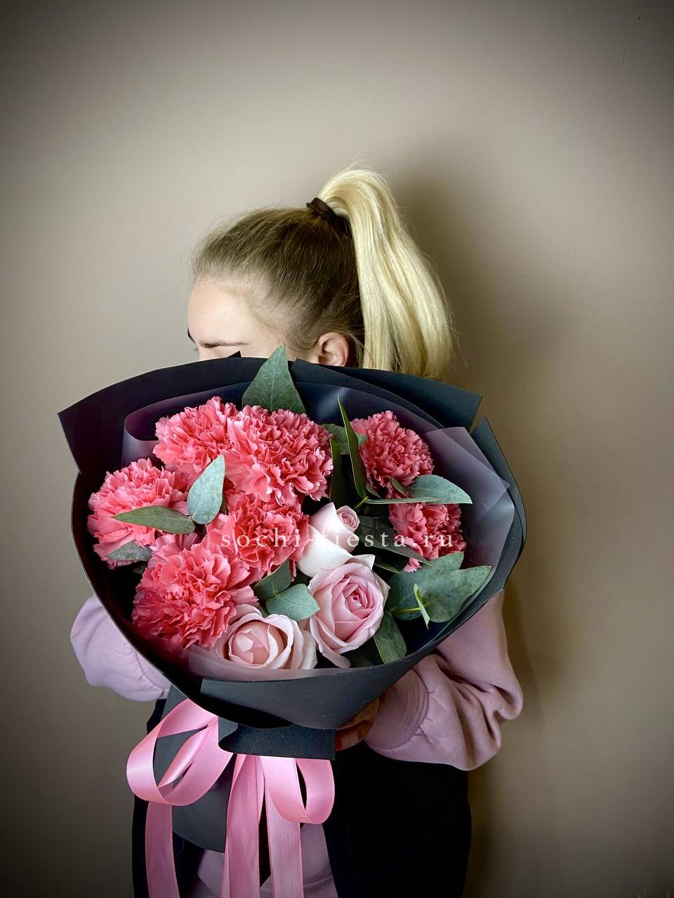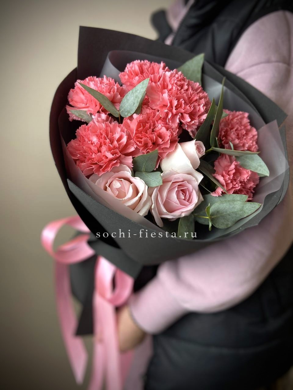 хризантема, гортензия, розовая роза, эустома, пионы ( может меняться, в зависимости от сезона), бомбастик, диантус, лента.