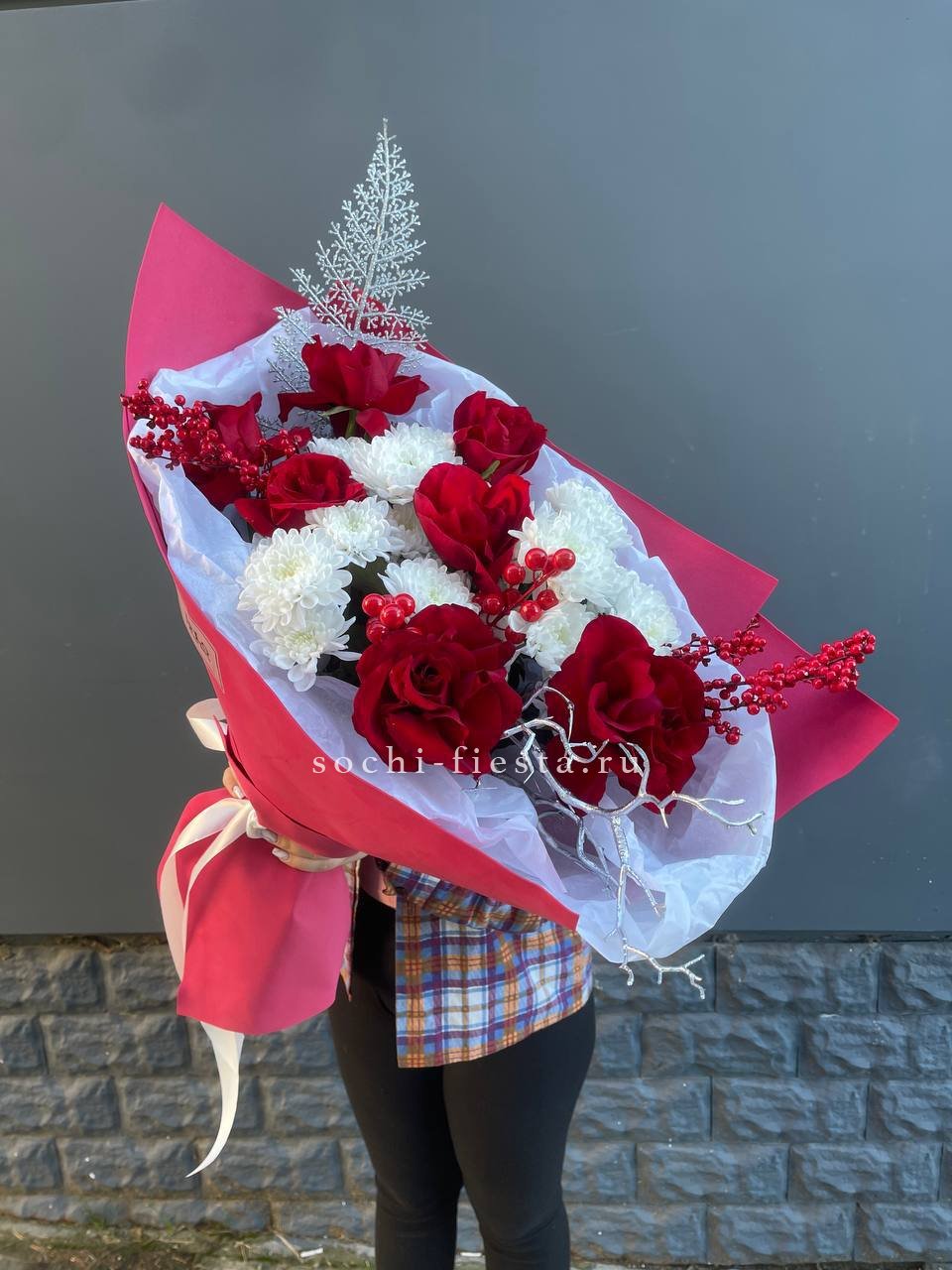 Красные розы и хризантемы звучат ярко и насыщенно в этой зимней композиции. Праздничный декор добавляет настроения, а плотная форма букета создает выразительное присутствие. Для тех моментов, когда нужен цвет и энергия.
