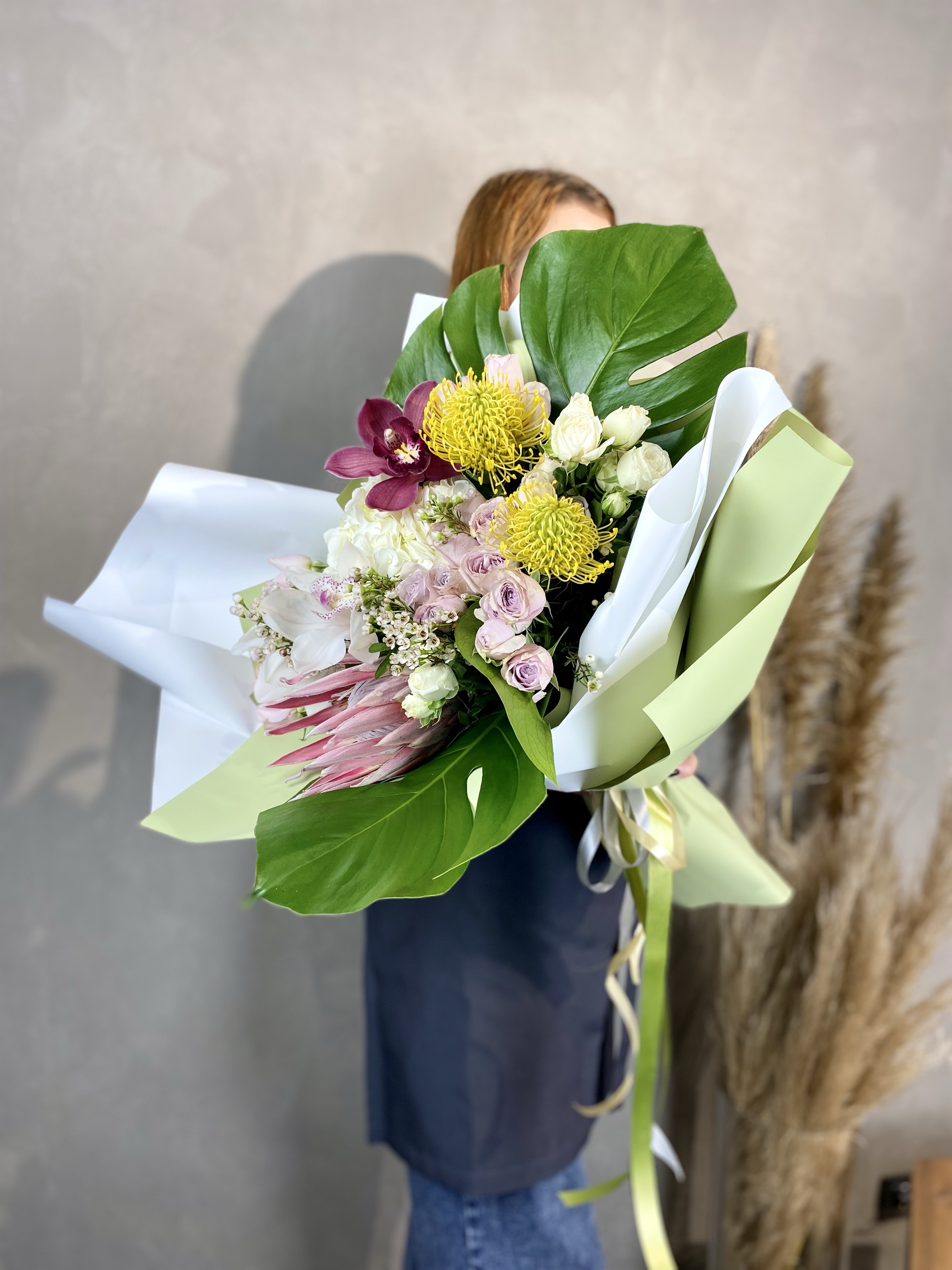 Протея и орхидеи задают графичный ритм, а пионовидные розы добавляют объём и мягкость линий. Гортензия создаёт плотную базу, на фоне которой каждый экзотический бутон читается ярче.
