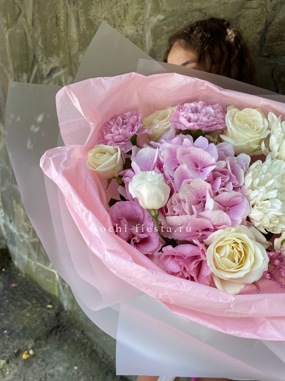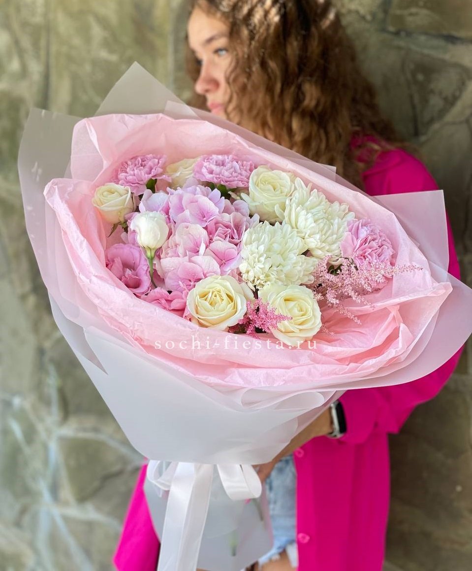 Этот пышный авторский букет напоминает нежное зефирное облако, в котором гармонично сочетаются объемные формы и изысканные оттенки. Композиция представляет собой микс из крупных соцветий гортензии и кустовых роз в пастельной гамме.