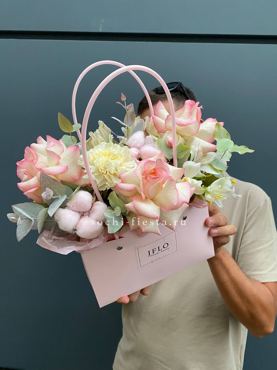 джумилия, хлопок, диантус, альстромерия, эвкалипт.